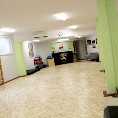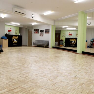 Posiadamy salę o powierzchni ok 150 metrów, wyposażoną w sprzęt sportowy (piłki, taśmy, maty, materace, drążki, hantle, itp.), klimatyzację oraz sprzęt nagłośnieniowy. Do dyspozycji klientów są również szatnie: damska i męska oraz toalety z natryskami. Na naszej sali organizowane są zajęcia grupowe, indywidualne, a także jest możliwość wynajmu sali dla swoich grup/zajęć.